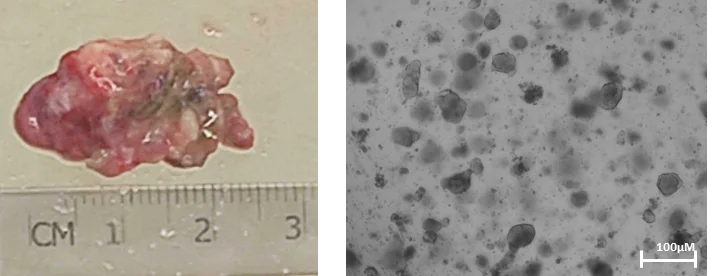 Links: Tumorgewebe von Patienten. Rechts: Aus dem Tumorgewebe generierte Tumor-Organoide. Aufnahme mit dem einem Hellfeldmikroskop. Maßstab: 100µm = Querschnitt eines menschlichen Haares
